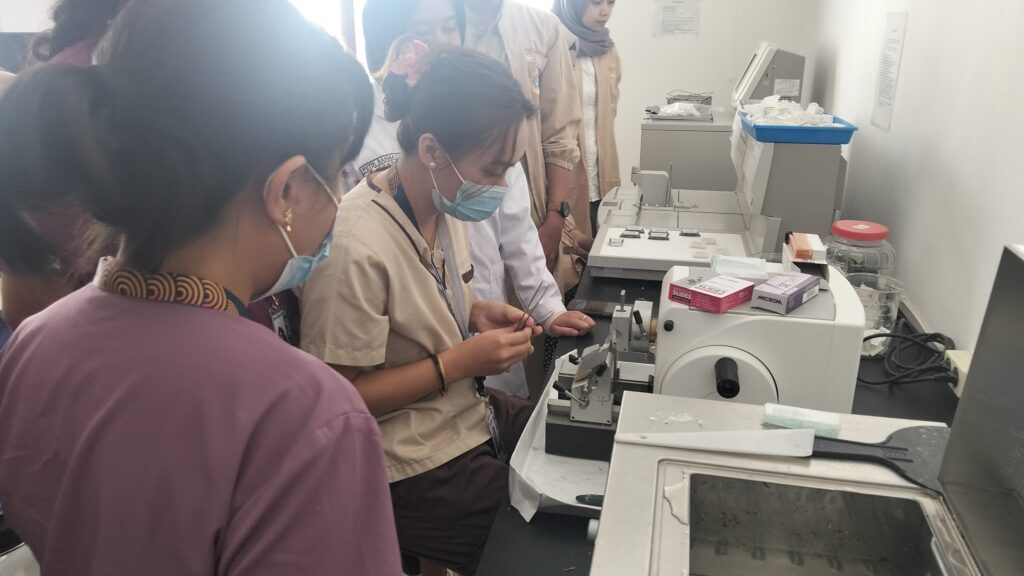 Setelah proses nekropsi selesai, mahasiswa melanjutkan kegiatan dengan pembuatan preparat histopatologi dari jaringan dan organ yang telah diambil. Mereka berkesempatan untuk mencoba teknik blocking, yaitu proses memasukkan jaringan ke dalam cetakan yang diisi parafin cair. Proses ini dilanjutkan dengan sectioning, yakni memotong jaringan menggunakan alat mikrotom menjadi irisan tipis yang memungkinkan pengamatan mikroskopis.