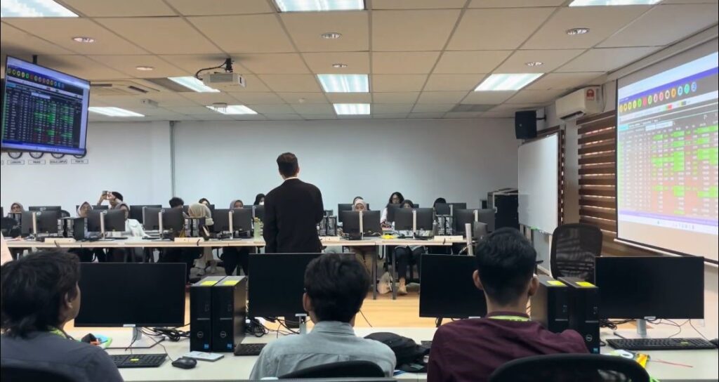 Sementara itu, dalam Finance Session, peserta diajak mengenal dunia pasar saham melalui simulasi Bursa Saham Malaysia menggunakan aplikasi CGS. Mahasiswa diperkenalkan cara membaca tren saham, menganalisis pergerakan harga, dan membuat keputusan pembelian atau penjualan saham dalam kondisi pasar yang disimulasikan secara real time. Aktivitas ini mendorong peserta untuk memahami pentingnya literasi finansial sejak dini, terutama bagi generasi muda yang akan memasuki dunia kerja dan kewirausahaan.