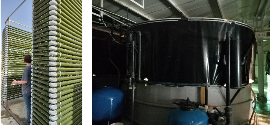 Gambar 2. Kultur pakan alami (kiri); dan kolam induk ikan sea bass (kanan)