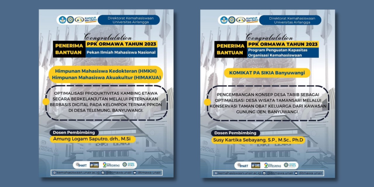 Read MoreBERITA SIKIA – Direktorat Kemahasiswaan Universitas Airlangga telah mengumumkan penerima bantuan pendanaan PPK ORMAWA 2023. Dua tim PPK Ormawa SIKIA UNAIR berhasil memenangkan pendanaan tersebut. Pengumuman berdasarkan keputusan Direktorat Pembelajaran dan Kemahasiswaan 2023 Kemendikbudristek. Pendanaan yang diberikan untuk meningkatkan kapasitas organisasi kemahasiswaan melalui kegiatan yang diimplementasikan dalam bentuk program pengabdian dan pemberdayaan masyarakat. Penerimaan bantuan […]