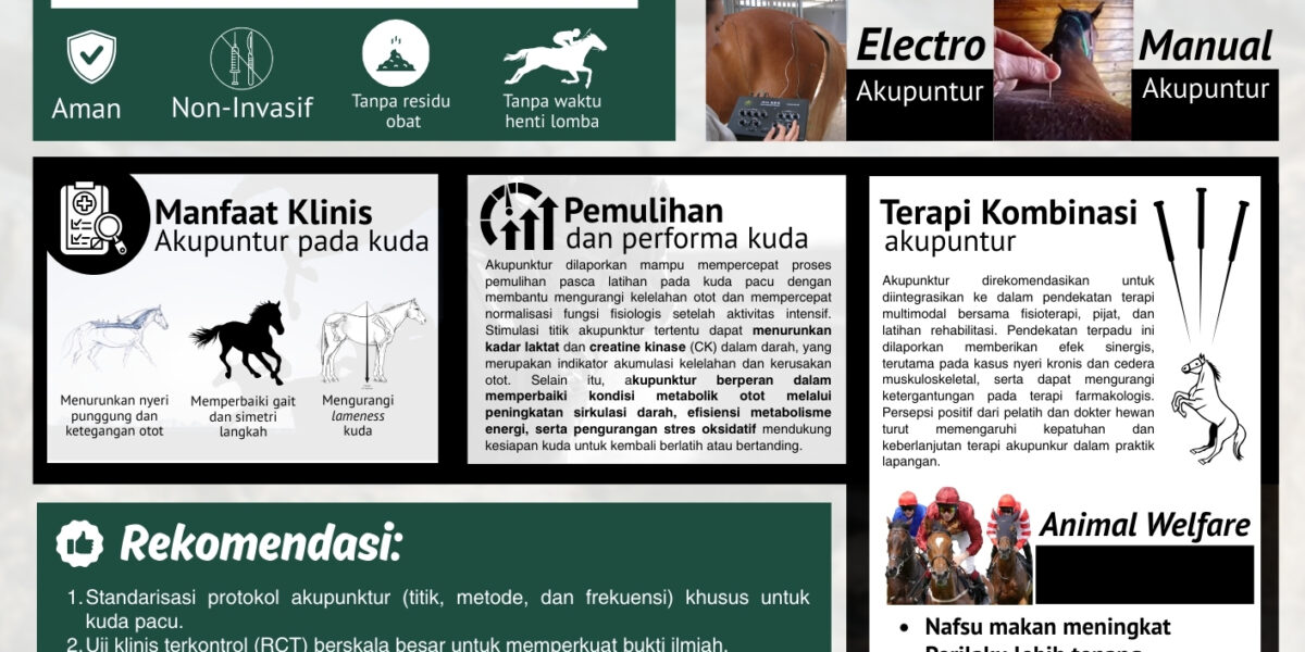 Read MoreKuda pacu menghadapi tuntutan fisik yang sangat tinggi, sehingga rentan mengalami nyeri muskuloskeletal, kelelahan, dan penurunan performa. Penanganan kondisi ini umumnya melibatkan terapi farmakologis, namun penggunaannya dibatasi oleh regulasi anti-doping dalam olahraga balap kuda. Oleh karena itu, diperlukan pendekatan non-farmakologis yang aman dan efektif. Akupunktur, yang berasal dari Traditional Chinese Veterinary Medicine, semakin mendapat perhatian […]