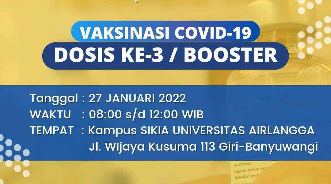 [ad_1] *Vaksinasi Dosis 3-Pfizer di Sekolah Ilmu Kesehatan dan Ilmu Alam Universitas Airlangga* Sasaran : Civitas akademika Universitas Airlangga dan umum Persyaratan : 1. Sudah mendapatkan vaksinasi dosis 2 (Sinovac/Astra Zeneca) 2. Jarak vaksinasi dosis 2 ke dosis 3 lebih dari 6 bulan 3. Membawa fotokopi KTP 4. Menunjukkan bukti vaksinasi ke 2 / peduliLindungi […]
