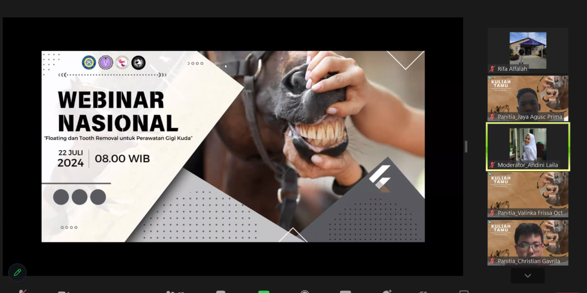 Read MoreKABAR FIKKIA – Himpunan Mahasiswa Kedokteran Hewan (HMKH) Fakultas Ilmu Kesehatan, Kedokteran, dan Ilmu Alam (FIKKIA) Universitas Airlangga (UNAIR) Banyuwangi terus meningkatkan pengetahuan bidang kesehatan perkudaan. Melalui kegiatan Divisi Equine Care berupa kuliah tamu yang dihelat Senin (22/7/2024), HMKH menghadirkan drh. RIfa Alfalah sebagai pemateri sekaligus praktisi kuda. Kegiatan tersebut mengangkat tajuk “Equine Dentistry: Essential Care For Horse Health” yang terselenggara secara daring melalui zoom meeting.