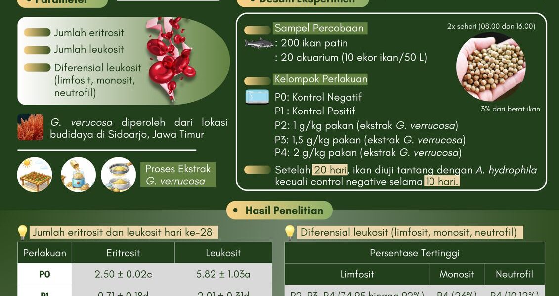 Read MoreBudidaya ikan patin (Pangasius hypophthalmus) merupakan sektor ekonomi yang signifikan di Asia Tenggara, namun keberhasilannya sering terancam oleh bakteri Aeromonas hydrophila. Penyakit Motile Aeromonas Septicemia (MAS) ini bersifat akut dan dapat menyebabkan tingkat kematian hingga 100% akibat sistem kekebalan tubuh ikan yang melemah. Sebagai solusi berkelanjutan, penelitian ini menguji potensi alga merah Gracilaria verrucosa sebagai […]