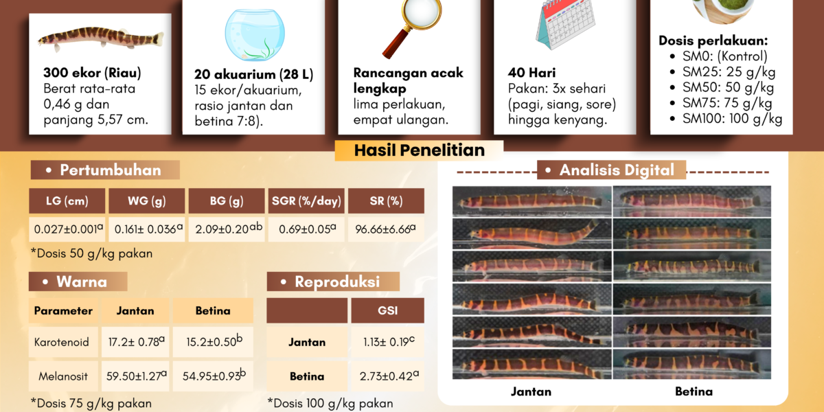 Read MoreIkan Kuhli loach (Pangio kuhlii) adalah komoditas ikan hias populer dengan nilai ekonomi tinggi. Namun, ketergantungan pada tangkapan alam mengancam populasi aslinya, sehingga budidaya ex-situ menjadi sangat krusial. Tantangan utama dalam budidaya adalah penurunan kualitas warna dan adaptasi pakan buatan. Penelitian ini menguji penggunaan tepung Spirulina sp. sebagai suplemen pakan untuk meningkatkan pertumbuhan, pigmentasi, dan […]