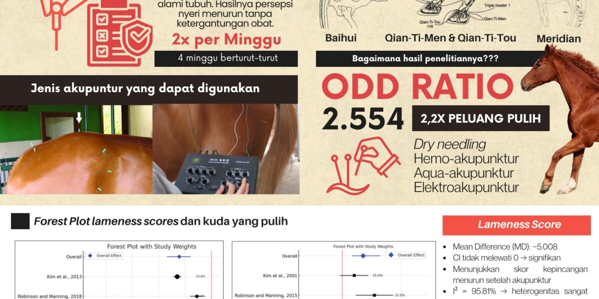 Read MoreLaminitis merupakan salah satu gangguan muskuloskeletal paling serius pada kuda karena menyebabkan peradangan dan kerusakan pada jaringan lamina yang menghubungkan tulang pedal dengan dinding kuku. Kondisi ini menimbulkan nyeri hebat, kepincangan, hingga penurunan performa, bahkan dapat berujung pada kecacatan permanen. Dalam dua dekade terakhir, akupunktur semakin banyak dimanfaatkan sebagai terapi komplementer dalam penanganan laminitis. Pendekatan […]