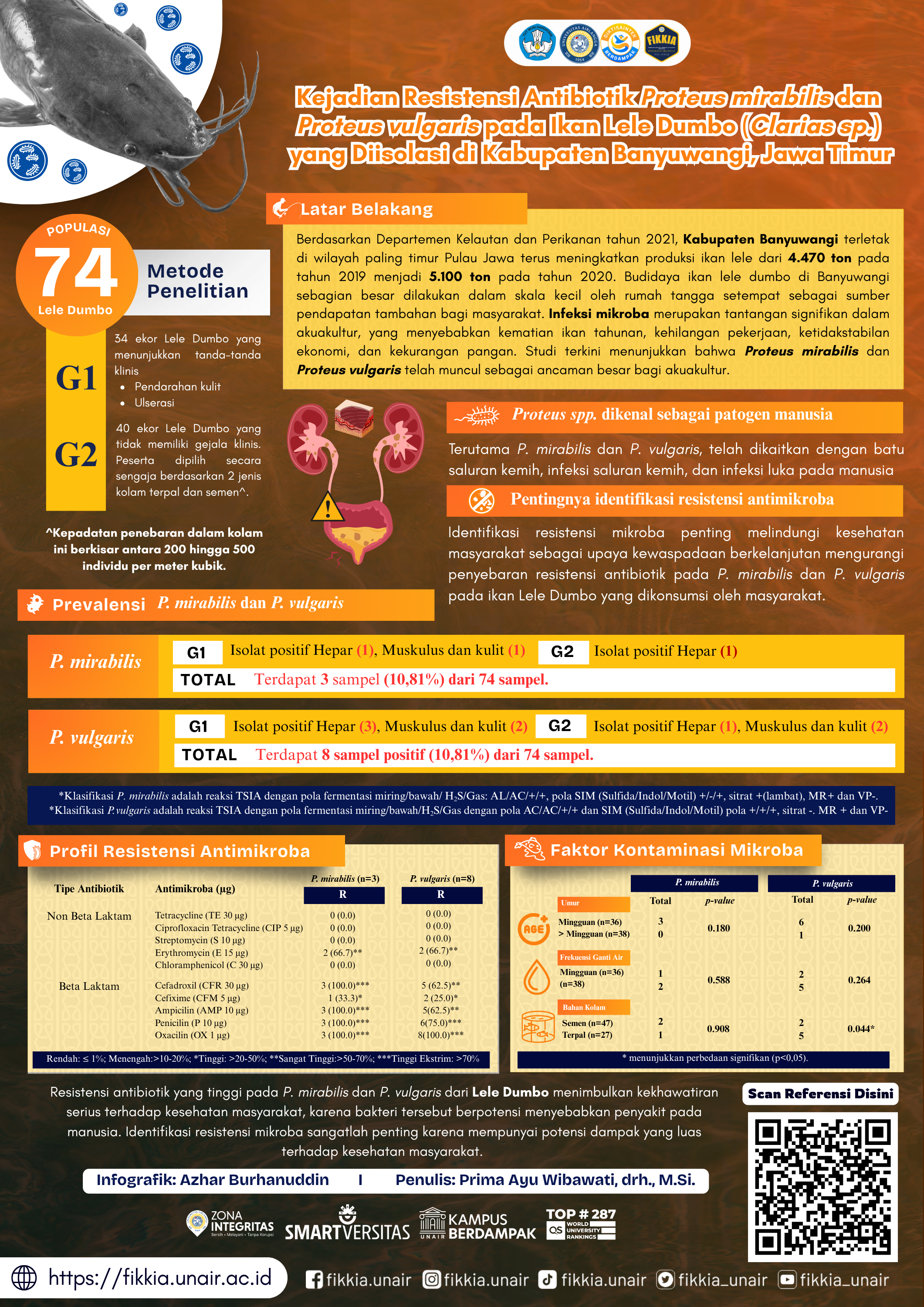 Read MorePenelitian berjudul “Kejadian resistensi antibiotik Proteus mirabilis dan Proteus vulgaris pada Ikan Lele Dumbo (Clarias sp.) yang diisolasi dari Kabupaten Banyuwangi, Jawa Timur, Indonesia” mengungkap adanya resistensi tinggi kedua bakteri tersebut terhadap berbagai antibiotik, khususnya golongan beta-laktam, pada ikan lele dumbo yang dibudidayakan secara lokal. Studi ini mencatat prevalensi P. mirabilis sebesar 4,05% dan P. […]