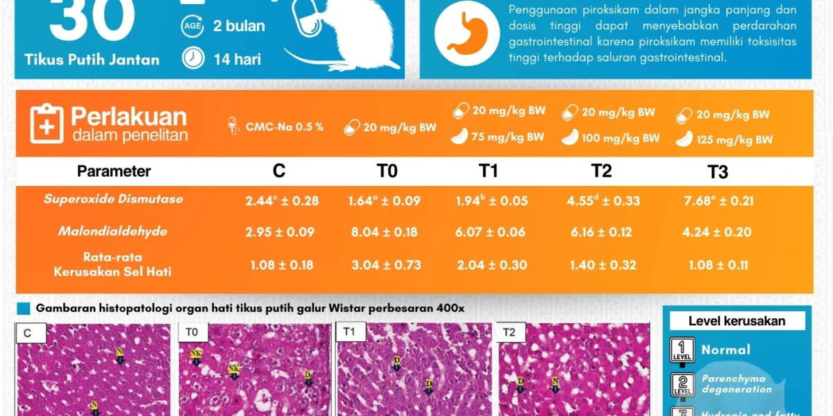 Read MorePiroxicam, obat antiinflamasi nonsteroid, sering digunakan untuk menginduksi peradangan pada model eksperimental inflammatory bowel disease (IBD) karena kemampuannya memodulasi sistem imun, merusak barier mukosa, dan meningkatkan produksi reactive oxygen species (ROS). Penelitian ini bertujuan mengevaluasi pengaruh ekstrak bawang putih tunggal (Allium sativum var. solo garlic) (SGE) terhadap gambaran histopatologi hati, kadar superoxide dismutase (SOD), dan […]