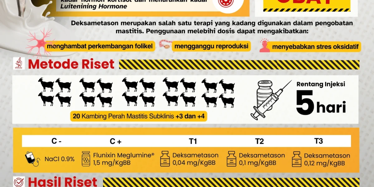 Read MoreMastitis merupakan salah satu penyakit yang sering terjadi pada kambing perah dan berdampak signifikan dalam menurunkan produksi susu. Deksametason sering digunakan dalam terapi mastitis, namun penggunaan berlebih dapat memicu stres oksidatif, menghambat perkembangan folikel, serta mengganggu fungsi reproduksi. Selain itu, stres akibat mastitis juga dapat meningkatkan kadar hormon kortisol dan menurunkan sekresi luteinizing hormone (LH). […]