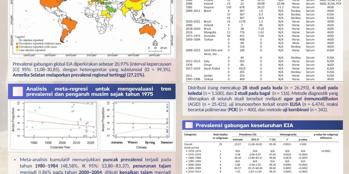 Read MoreEquine Infectious Anemia (EIA) adalah penyakit lentivirus pada kuda dengan prevalensi global sekitar 20,97%, tertinggi di Amerika Selatan (27,21%). Tren prevalensi sejak 1975 berfluktuasi, dengan puncak 48,58% pada 1980–1984, lalu menurun tajam dan kembali turun pada 2010–2019. Angka kasus lebih tinggi pada musim panas. Metode diagnosis utama adalah AGID, ELISA, dan PCR, dengan kombinasi ketiganya […]