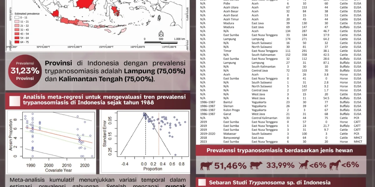 Read MoreTrypanosomiasis adalah penyakit parasit penting yang masih endemik di Indonesia dengan prevalensi rata-rata 31,23%, tertinggi di Lampung dan Kalimantan Tengah (75%). Tren prevalensi sejak 1988 menunjukkan fluktuasi dengan penurunan terakhir pada 41,86% (2016–2024). Berdasarkan jenis hewan, sapi paling tinggi terinfeksi (51,46%), disusul kuda (33,99%), sedangkan kambing dan kerbau <6%. Penyakit ini memerlukan pengawasan berkelanjutan, peningkatan […]