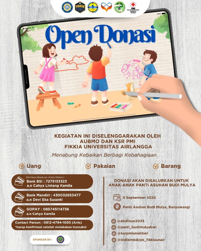 Kami dari AUBMO FIKKIA dan KSR PMI FIKKIA Universitas Airlangga akan mengadakan ABDI ISUN X BAKTI SOSIAL untuk berbagi kebahagiaan bersama saudara-saudara di Panti Asuhan Budi Mulyaβ¨.