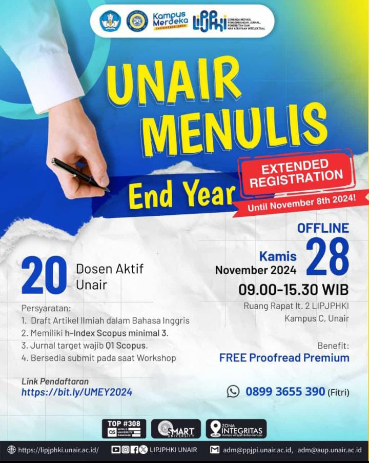 Akhir Tahun Ceria!! Unair Menulis End of the Year 2024 telah dibuka! Program ini khusus bagi dosen Unair dengan minimal h-indeks 3, memiliki draft artikel dan bersedia submit di jurnal Scopus Q1 pada saat kegiatan.