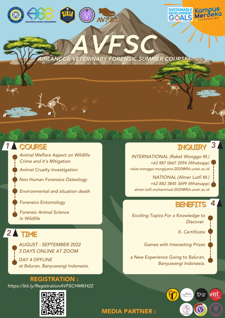Sekolah Ilmu Kesehatan dan Ilmu Alam (SIKIA) Universitas Airlangga is calling for participants to join the annual webinar and workshop series, AIRLANGGA VETERINARY FORENSICS SUMMER COURSE. AVFSC 2022 is great to make positive contributions to sustainable development. It has an awareness of local potentials and problems which focuses on forensics and its implementation in the field of Veterinary Medicine.