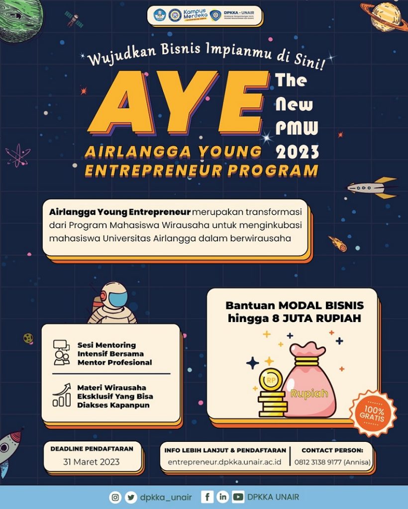 Buat kamu mahasiswa aktif UNAIR yang punya ide bisnis atau sedang merintis bisnis, yuk daftarkan dirimu di Airlangga Young Entrepreneur sekarang juga!!!
