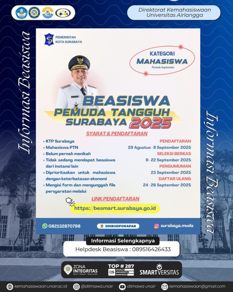 Dinas Kebudayaan, Kepemudaan dan Olahraga Serta Pariwisata (DISBUDPORAPAR), Pemerintah Kota Surabaya pada Tahun 2025 memberikan beasiswa (Beasiswa Pemuda Tangguh Surabaya) kepada mahasiswa Universitas Airlangga dengan persyaratan sebagai berikut :