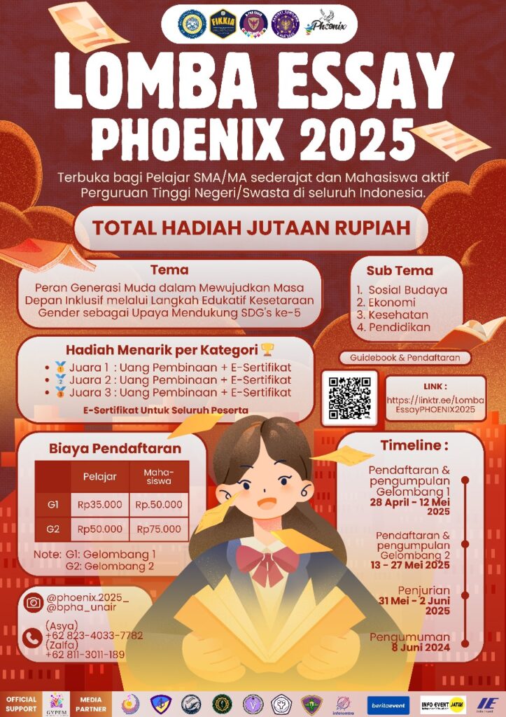 Buat kamu, pelajar SMA/MA & Mahasiswa di seluruh Indonesia, saatnya unjuk kreativitas dan kepedulianmu terhadap isu kesetaraan gender dalam kompetisi ESSAY PHOENIX 2025 dengan tema “Peran Generasi Muda dalam Mewujudkan Masa Depan Inklusif melalui Langkah Edukatif Kesetaraan Gender sebagai Upaya Mendukung SDG’s ke-5.”