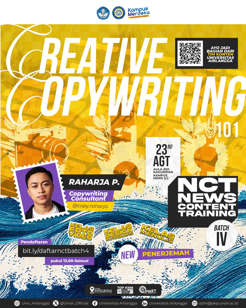 Pelatihan ini gratis dan kuota terbatas untuk mahasiswa Universitas Airlangga. Ikuti acara ini sampai akhir dan dapatkan kesempatan untuk bergabung menjadi bagian dari News and Content Training. Segera daftarkan dirimu di link berikut: https://bit.ly/daftarnctbatch4