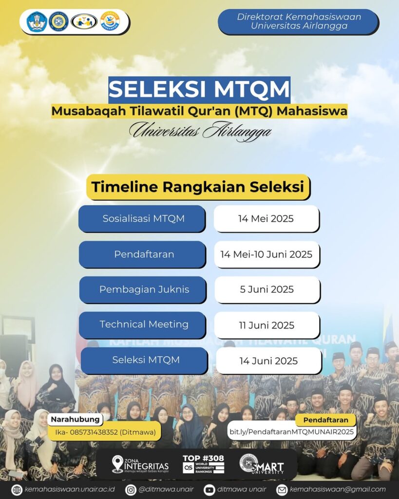 Universitas Airlangga, Surabaya – 14 Mei 2025 – Universitas Airlangga (UNAIR) membuka pendaftaran untuk Musabaqah Tilawatil Qur’an Mahasiswa (MTQM) yang akan diselenggarakan pada bulan Juni 2025. Acara ini adalah kesempatan bagi mahasiswa untuk mengembangkan kemampuan dalam membaca dan melantunkan Al-Qur’an sesuai dengan ketentuan dan syarat-syarat yang berlaku.