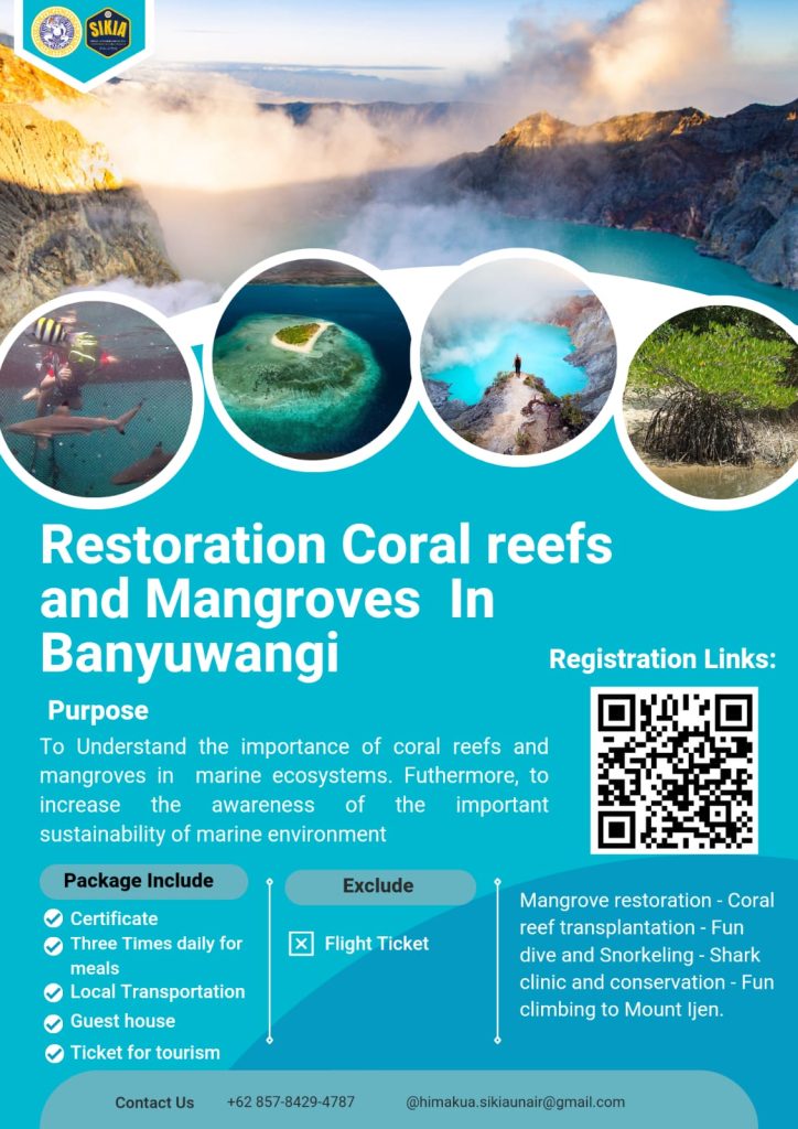 School of Health and Life Sciences (SIKIA) Airlangga University is calling for participants to join the annual workshop series, Coral Reef and Mangrove Restoration in Banyuwangi is one of Airlangga Global Engagement programs that aims to educate about the importance of protecting mangrove and coral reef ecosystems. In addition, this program aims to increase awareness of the importance of preserving the marine environment. Its main activity is to restore coral reefs and mangroves in Banyuwangi, where this activity aims to restore damaged natural resources to their original condition. This activity was carried out in two places, namely restoring mangroves at Cemara Beach and restoring coral reefs at Tabuhan Island.
