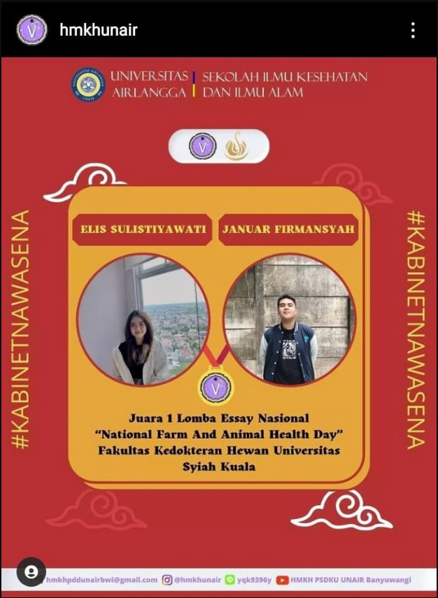 UNAIR NEWS – Prestasi membanggakan kembali ditorehkan oleh dua mahasiswa Fakultas Kedokteran Hewan, Sekolah Ilmu Kesehatan dan Ilmu Alam, Universitas Airlangga (FKH SIKIA UNAIR). Mereka adalah Januar Firmansyah dan Elis Sulistiyawati. Pada kegiatan lomba esai yang diselenggarakan oleh Universitas Syiah Kuala dengan tema National Farm and Animal Health Day, kedua mahasiswa tersebut berhasil menyabet Juara I dengan mengusung gagasan berupa aplikasi INDUKAN (Informasi Dunia Peternakan).