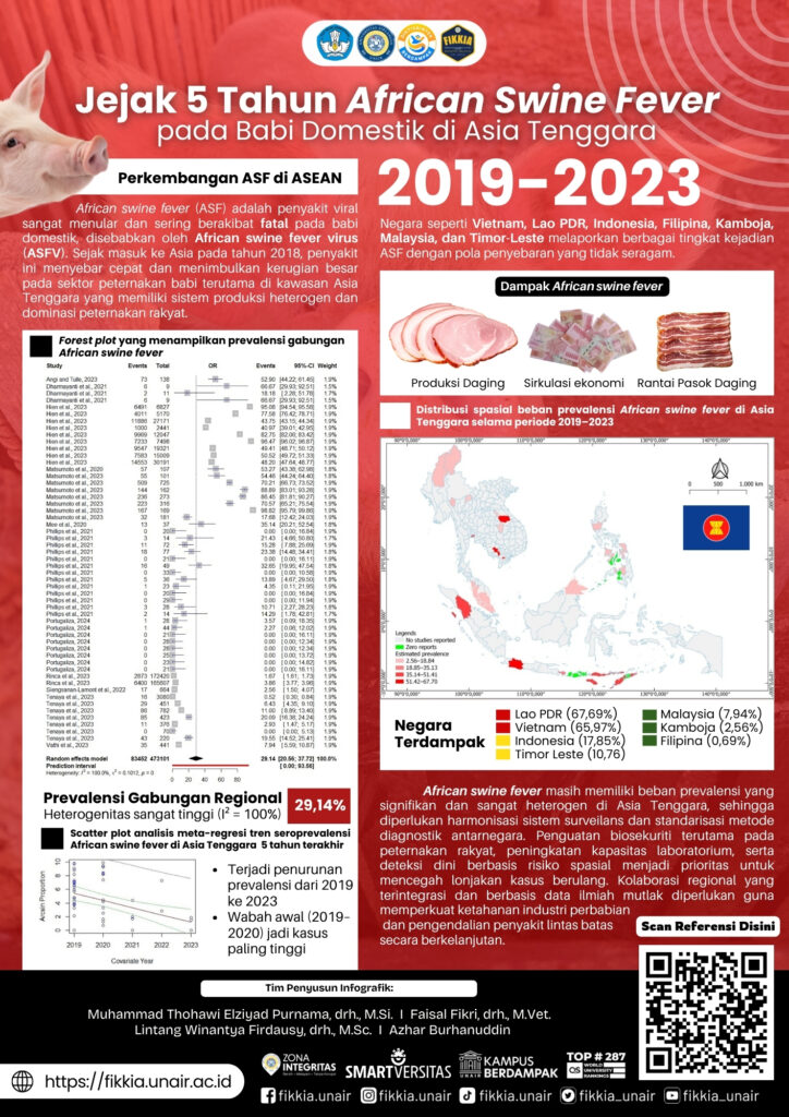 Wabah African swine fever (ASF) terus menjadi ancaman serius bagi sistem produksi babi di Asia Tenggara sejak pertama kali merebak secara luas pada 2019. Melalui tinjauan sistematis dan meta-analisis terhadap 12 studi dari tujuh negara di kawasan ini, penelitian terbaru menemukan bahwa rata-rata prevalensi ASF mencapai 29,14%, dengan variasi yang sangat besar antarwilayah dan metode pemeriksaan. Kasus tertinggi dilaporkan di Vietnam dan Lao PDR, dengan pemetaan spasial menunjukkan konsentrasi beban penyakit yang menonjol di Lao PDR dan Vietnam bagian selatan.