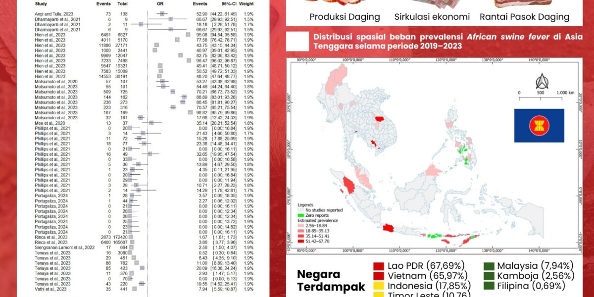 Wabah African swine fever (ASF) terus menjadi ancaman serius bagi sistem produksi babi di Asia Tenggara sejak pertama kali merebak secara luas pada 2019. Melalui tinjauan sistematis dan meta-analisis terhadap 12 studi dari tujuh negara di kawasan ini, penelitian terbaru menemukan bahwa rata-rata prevalensi ASF mencapai 29,14%, dengan variasi yang sangat besar antarwilayah dan metode pemeriksaan. Kasus tertinggi dilaporkan di Vietnam dan Lao PDR, dengan pemetaan spasial menunjukkan konsentrasi beban penyakit yang menonjol di Lao PDR dan Vietnam bagian selatan.