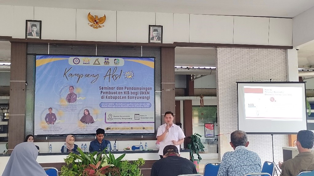 Pengabdian Masyarakat dari Himpunan Mahasiswa Akuntansi dilaksanakan melalui seminar dengan tema mengenai Sosialisasi dan Pendampingan Pembuatan NIB. Pendampingan tersebut ditujukan kepada para UMKM yang berada di Kecamatan Genteng, Banyuwangi.