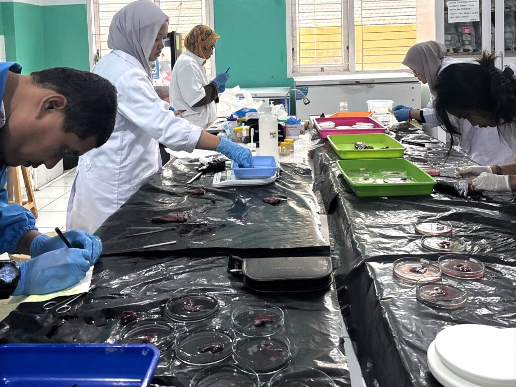 Pengumpulan sampel dilakukan selama lima hari (11-15/08/2025) di Laboratorium Terpadu 3 Kampus Giri FIKKIA UNAIR. Sampel yang diperiksa diantaranya adalah ikan layur, ikan tongkol, ikan kerapu, ikan jenggot, dan kepiting rajungan. Proses pemeriksaan dimulai dengan identifikasi jenis ikan dan kepiting serta melakukan dokumentasi. Selanjutnya pengukuran morfometrik meliputi: