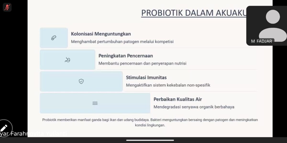 Beliau menekankan bahwa imunostimulan bukanlah pengganti vaksin, melainkan pelengkap yang memperkuat respons imun ikan dan udang dalam jangka pendek maupun menengah. Dengan pemanfaatan yang tepat, imunostimulan mampu menekan tingkat kematian, mempercepat pertumbuhan, serta mengurangi penggunaan antibiotik dalam budidaya, sehingga lebih ramah lingkungan dan berkelanjutan. Beberapa hasil riset terbaru yang dipaparkan juga menunjukkan efektivitas imunostimulan dalam menekan infeksi dari bakteri dan virus yang umum menyerang udang vannamei dan ikan nila.