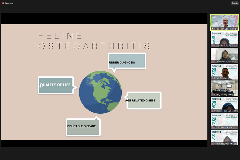 KABAR FIKKIA – Program Studi Kedokteran Hewan Fakultas Ilmu Kesehatan, Kedokteran, dan Ilmu Alam (FIKKIA) Universitas Airlangga Banyuwangi kembali menggulirkan kuliah tamu internasional. Diselenggarakan Rabu (15/5/2024), hadir secara daring Assoc Prof. Kumpanart Soonvipart dari Department of Surgery, Faculty of Veterinary Science, Chulalongkorn University Thailand (CUVet) melalui platform zoom meeting membawakan topik Feline Osteoarthritis. Prof. Kumpanart mengatakan risiko Osteoartritis terjadi karena genetik, Hip dysplasia (terutama pada kucing Maine Coon, Persians, Siamese), Patellar luxation (Abyssinian, Devon Rex), Osteochondrodysplasia (Scottish folds), trauma patah tulang dan Joint luxations, obesitas, penyakit ginjal kronis, Acromegaly pada kondisi kucing berusia tua seperti Pituitary gland tumor, pertumbuhan hormon yang berlebihan maupun kucing yang terkena diabetes.