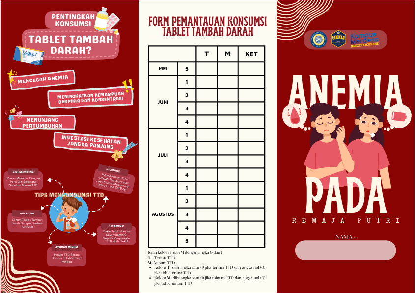 Mahasiswa membagikan brosur edukatif mengenai anemia yang dikemas informatif dan kekinian. Mahasiswa juga menjelaskan pentingnya konsumsi rutin TTD bagi remaja putri yang berisiko tinggi mengalami anemia akibat menstruasi. Para siswa diberi pemahaman terkait gejala anemia, dampak jangka panjangnya, serta langkah-langkah pencegahan yang bisa dilakukan sejak dini. Siswa putri sebelumnya telah rutin menerima TTD tiap bulan dari sekolah. Sehingga tabel pantau pada brosur dapat memonitoring konsumsi TTD siswa.