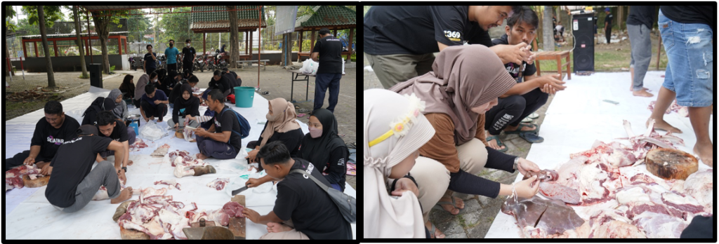 Tak hanya sebatas aktivitas penyembelihan hewan kurban semata, seluruh elemen yang terlibat bahu membahu dalam melakukan pemotongan bagian hewan kurban. Dimulai dari memasak makan siang, memotong, menimbang, dan membungkus daging kurban secara bersama-sama.