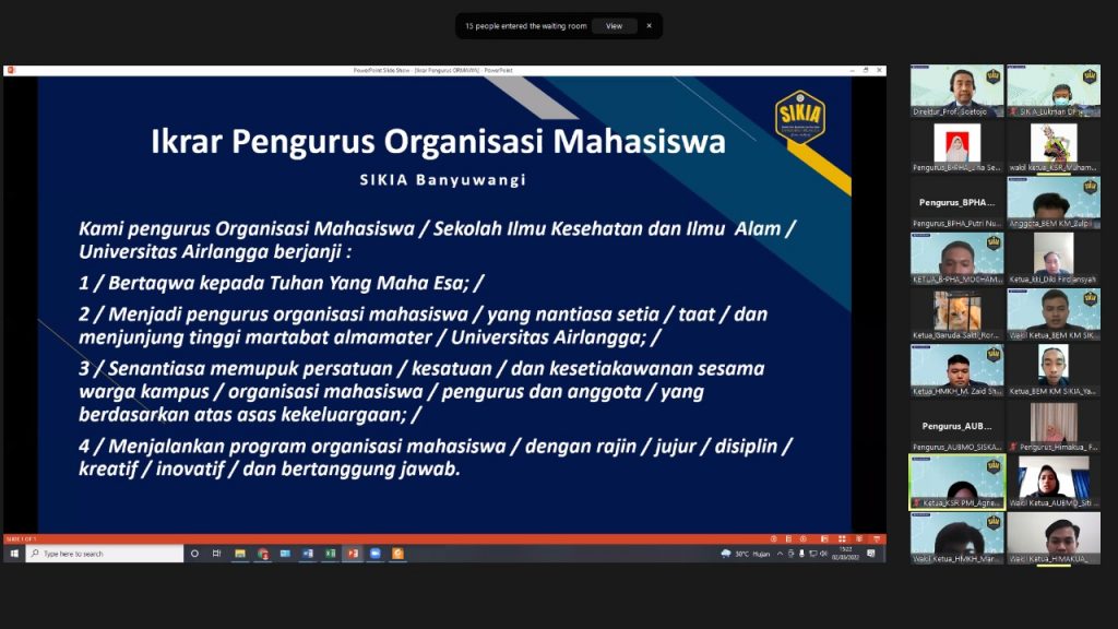 Banyuwangi – Melanjutkan estafet kepemimpinan organisasi mahasiswa Sekolah Ilmu Kesehatan dan Ilmu Alam (SIKIA) menggelar acara Pelantikan Ketua, Wakil Ketua, dan anggota pengurus Organisasi Mahasiswa (Ormawa) yang berlangsung secara daring pada hari Rabu (02/3).