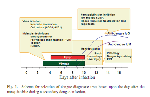 Pemeriksaan antibodi IgG dan IgM Anti Dengue berguna dalam diagnosis infeksi virus dengue. Kedua antibodi ini muncul 5-7 hari setelah infeksi. Bila pemeriksaan dilakukan sebelum periode tersebut, bisa kemungkinan hasilnya negatif palsu. Pemeriksaan yang lebih tepat untuk periode awal adalah dengan memeriksakan NS-1 Antigen, dimana dapat terdeteksi sekitar 2-9 hari (idealnya) setelah gejala muncul.