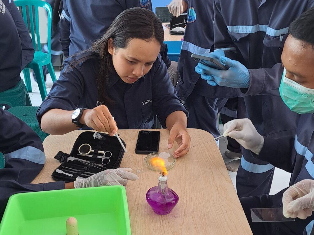 Kegiatan dilanjutkan dengan praktik pewarnaan gram. Maria dibantu rekan asisten praktikumnya Elysa Dwi Silvana dan Herda Zahra Apriliani terlebih dahulu mencontohkan kepada siswa. Mereka terlebih dahulu mengambil isolat bakteri dan meletakkannya pada objek glass yang sudah diberi akuades. Siswa SMK Ihya Ulumuddin dengan antusias penuh rasa penasaran melakukan praktik yang dilakukan secara berkelompok. Proses pewarnaan, pengeringan, sampai pengamatan dengan mikroskop dilakukan secara mandiri dengan pendampingan dosen dan guru.