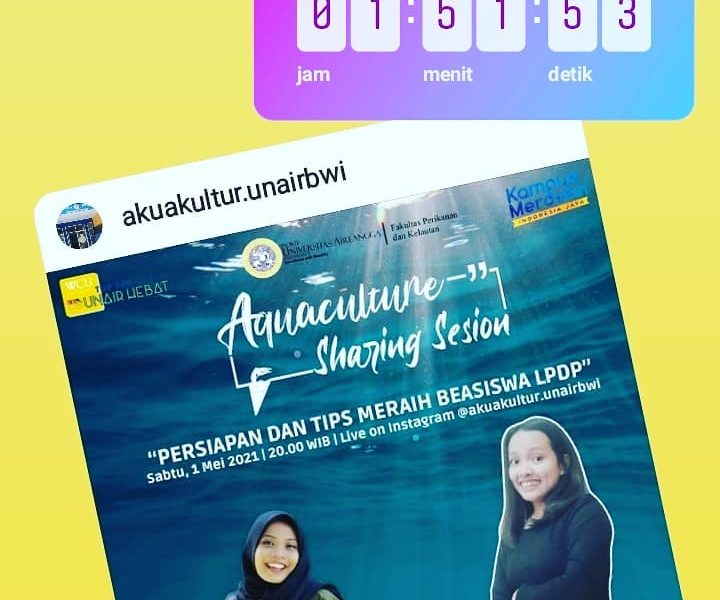 Read More[ad_1] Kurang dari 2 jam lagi on air… Jgn ketinggalan ya… [Aquaculture Sharing Session : live on instagram] “PERSIAPAN DAN TIPS MERAIH BEASISWA LPDP” Sabtu, 1 MEI 2021 20.00 WIB Instagram live @akuakultur.unairbwi BINTANG TAMU Maria Agustina Pardede, S.Pi. – @mariaagustinapardede ?Alumni @akuakultur.unairbwi Angkatan 2014 ?Peraih Beasiswa LPDP 2019 ?Mahasiswa S2 Ilmu Akuakultur IPB University […]
