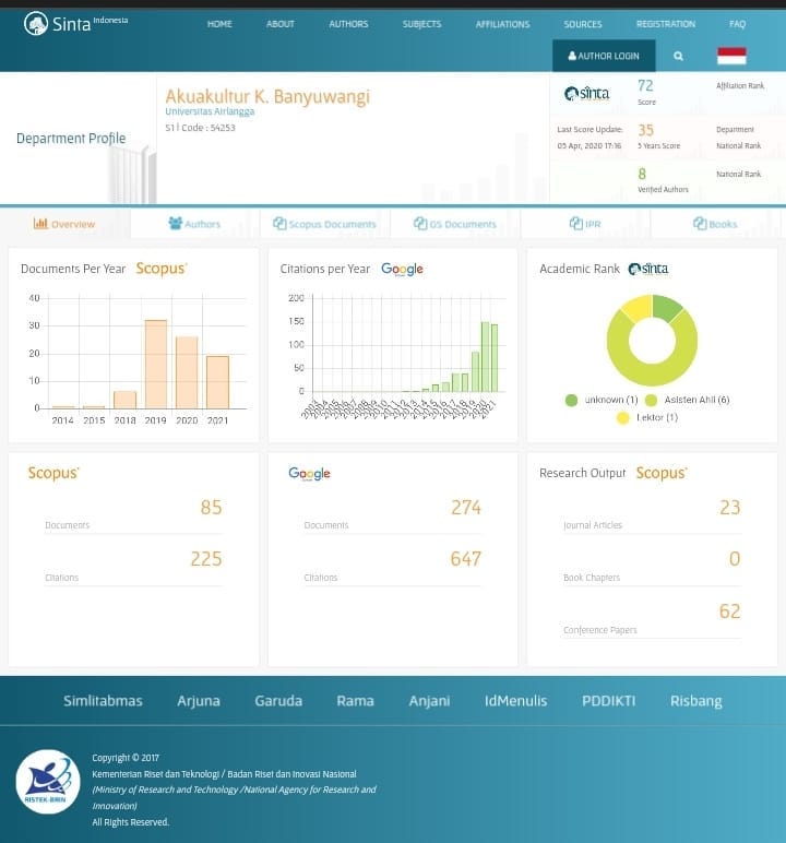 Profil capaian publikasi prodi @akuakultur.unairbwi berdasarkan https://www.sinta.ristekbrin.go.id/departments/detail?afil=380&id=54253&view=overview dengan 85 artikel terindeks scopus (Q4-Q1) dengan 225 sitasi , 274 artikel terindeks google schoolar dengan 647 sitasi.