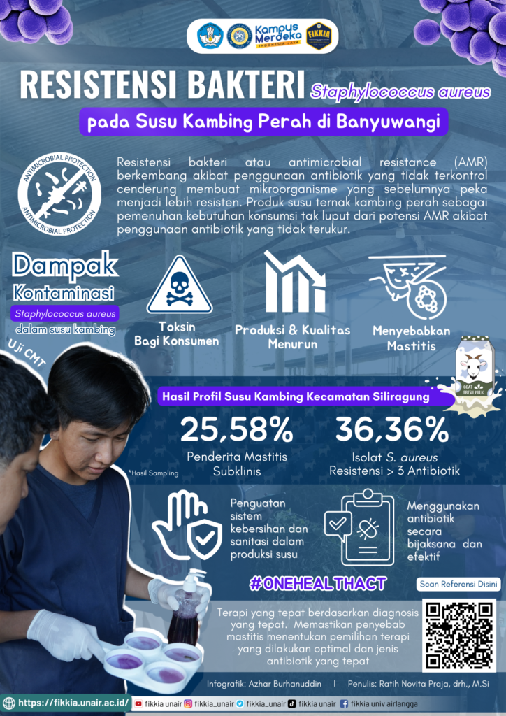 Resistensi bakteri atau antimicrobial resistance (AMR) berkembang akibat penggunaan antibiotik yang tidak terkontrol cenderung membuat mikroorganisme yang sebelumnya peka menjadi lebih resisten. Produk susu ternak kambing perah sebagai pemenuhan kebutuhan konsumsi tak luput dari potensi AMR akibat penggunaan antibiotik yang tidak terukur. Dampak kontaminasi bakteri staphyloccocus Aureus dapat mengakibatkan toksin bagi konsumen susu, produksi dan kualitas menurun, hingga menyebabkan mastitis. Upaya one health harus digalakkan untuk mengontrol dan memberikan terapi yang tepat.