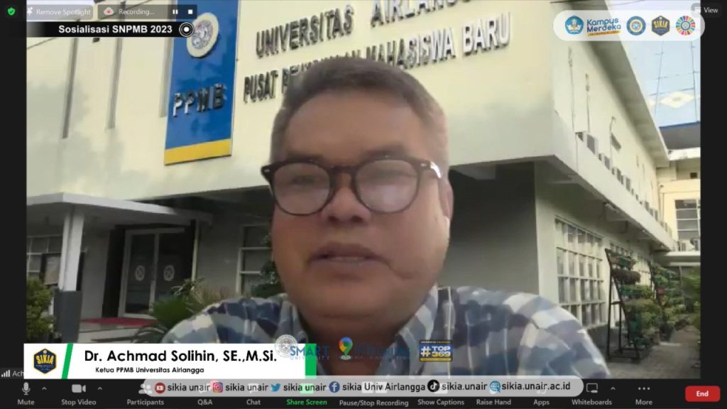 Kegiatan sosialisasi dilanjutkan dengan pemaparan skema terbaru terkait penerimaan mahasiswa baru 2023 oleh Dr. Achmad Solihin, S.E., M.Si selaku Ketua Pusat Penerimaan Mahasiswa Baru Universitas Airlangga.