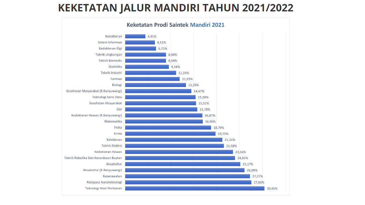 Sebagai contoh, Bapak Solihin menjelaskan keketatan prodi Kesehatan Masyarakat kampus Banyuwangi berada diangka 14,47%. Artinya dari 100 pendaftar hanya 14 orang yang diterima sebagai mahasiswa.