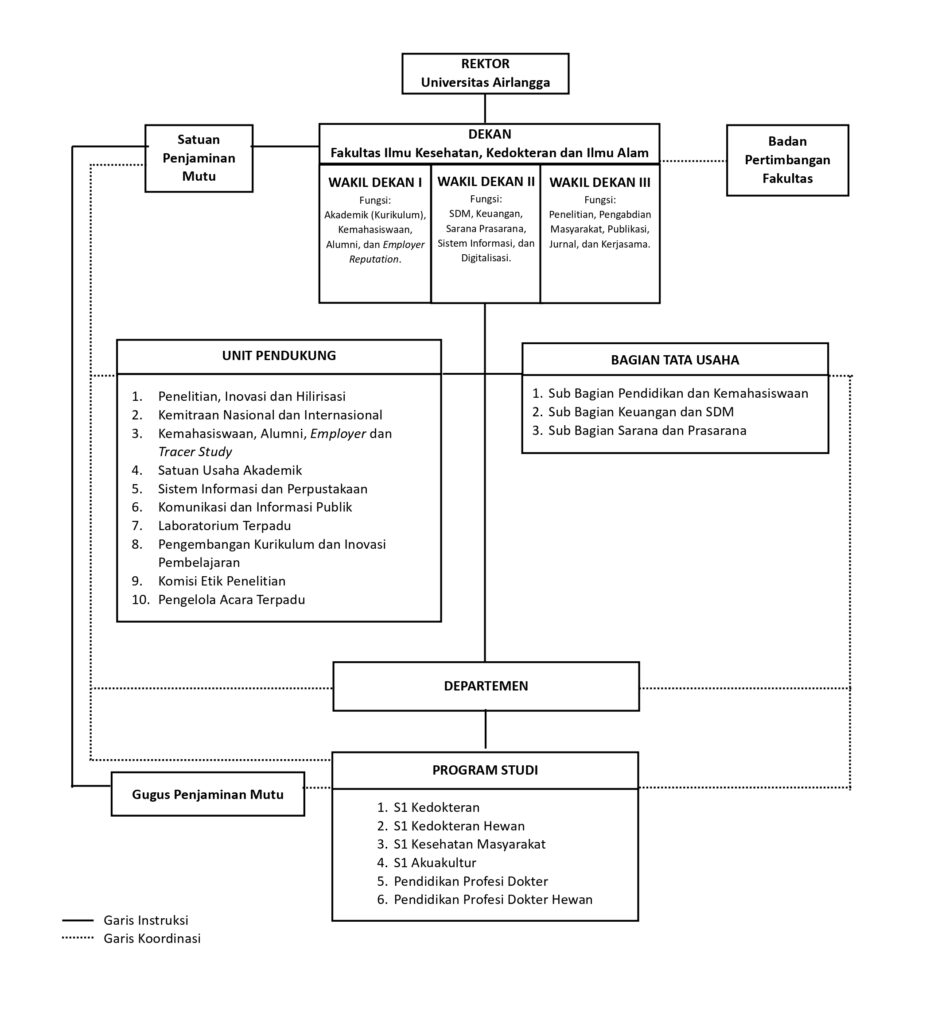 Fakultas Ilmu Kesehatan, Kedokteran, dan Ilmu Alam Universitas Airlangga (FIKKIA UNAIR) dipimpin oleh Dekan yang dibantu oleh Wakil Dekan I, II, dan III. Wakil Dekan I bertanggung jawab pada bidang akademik, kemahasiswaan, alumni, dan employer reputation. Wakil Dekan II menjalankan fungsi pengembangan sumberdaya manusia, keuangan, sarana prasarana, sistem informasi, serta digitalisasi. Sedangkan Wakil Dekan III membantu kerja organisasi urusan penelitian, pengabdian masyarakat, publikasi, jurnal, dan kerjasama.
