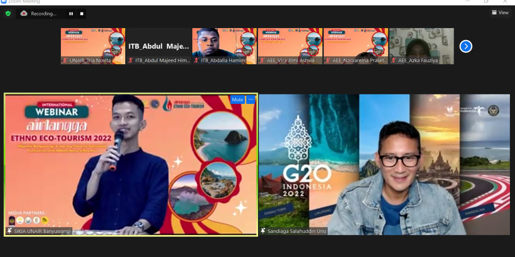 Selain didukung oleh civitas akademika SIKIA UNAIR Banyuwangi, acara tersebut disponsori langsung oleh Airlangga Global Engagement dengan target 30 peserta asing. Webinar pada Sabtu (23/7/2022) mengawali kegiatan AEE dengan menghadirkan keynote speaker Menteri Pariwisata dan Ekonomi Kreatif Indonesia Sandiaga Salahuddin Uno.