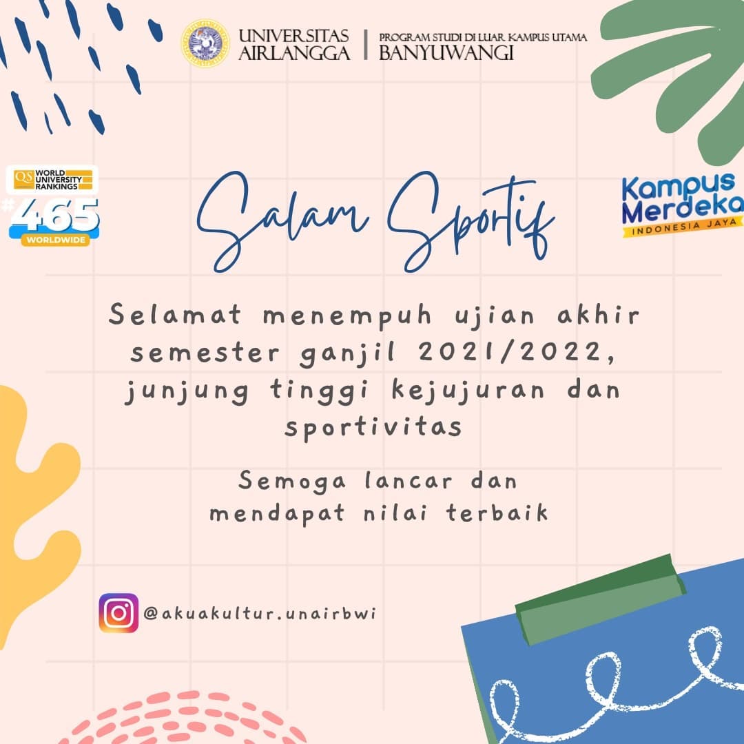 Teruntuk mahasiswa @akuakultur.unairbwi, selamat menempuh Ujian Akhir Semester Gasal 2021/2022, semoga diberi kemudahan dan mendapat nilai terbaik… Junjung tinggi kejujuran! Salam sportif!!