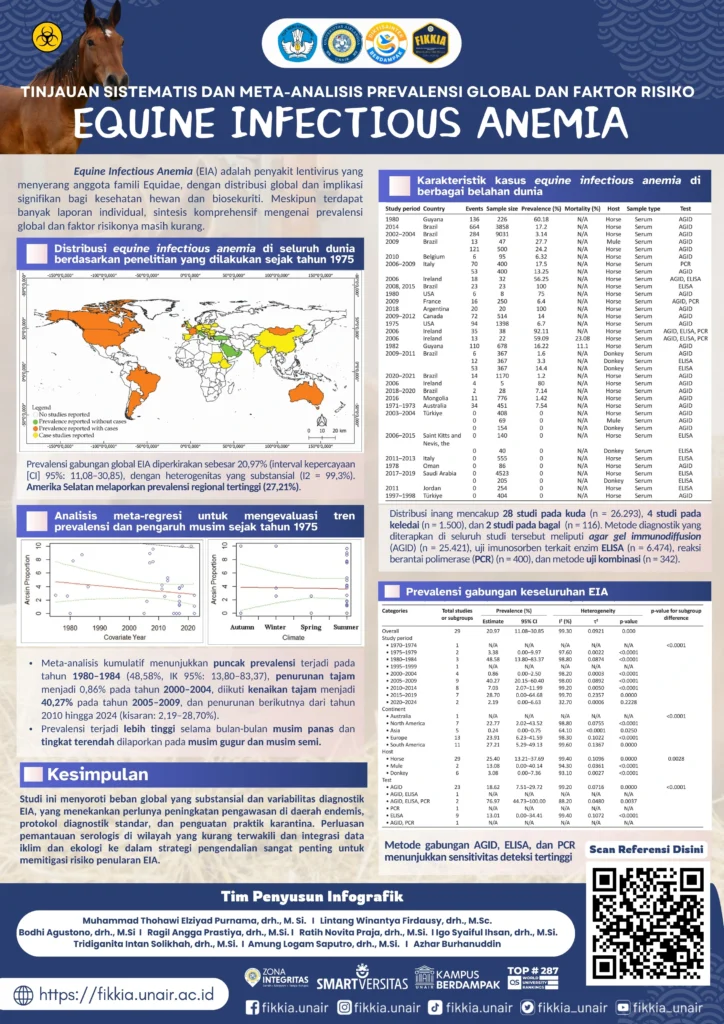 Equine Infectious Anemia (EIA) adalah penyakit lentivirus pada kuda dengan prevalensi global sekitar 20,97%, tertinggi di Amerika Selatan (27,21%). Tren prevalensi sejak 1975 berfluktuasi, dengan puncak 48,58% pada 1980–1984, lalu menurun tajam dan kembali turun pada 2010–2019. Angka kasus lebih tinggi pada musim panas. Metode diagnosis utama adalah AGID, ELISA, dan PCR, dengan kombinasi ketiganya paling sensitif. Diperlukan penguatan pengawasan, standarisasi diagnostik, dan perluasan pemeriksaan di daerah berisiko.