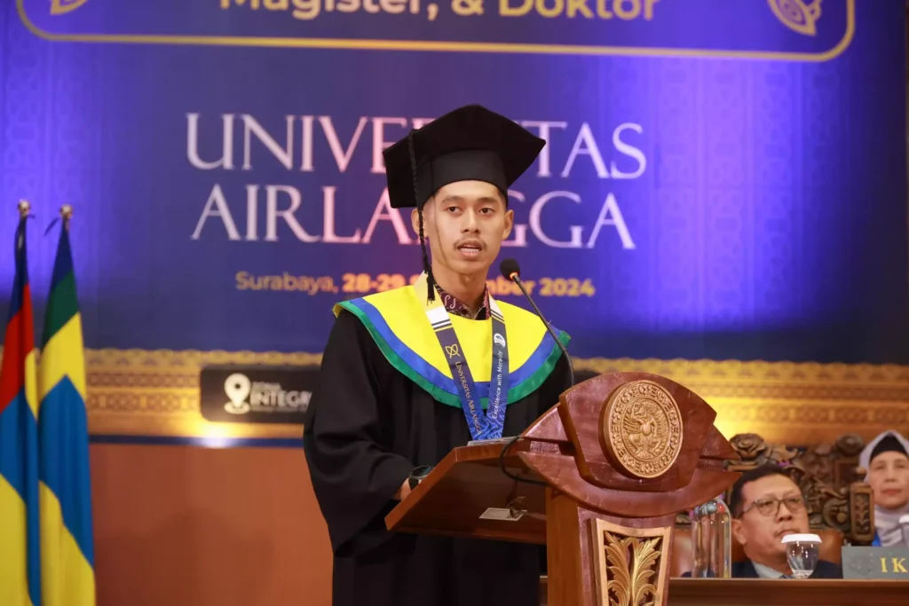 Daffa menyampaikan rasa terima kasih yang tulus kepada dosen dan tenaga kependidikan UNAIR yang telah menjadi pilar utama dalam perjalanan akademisnya. “Terima kasih kepada bapak ibu dosen yang telah membimbing kami selayaknya orang tua sendiri,” ujarnya dengan penuh hormat. Ia juga menyampaikan apresiasi mendalam kepada orang tua para wisudawan yang telah mendukung dengan penuh cinta dan pengorbanan.